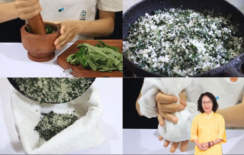 Bọc hỗn hợp vào khăn mỏng hoặc dùng tay áp trực tiếp lên vùng lưng đau nhức.