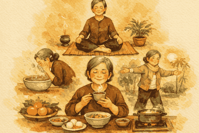 Bên cạnh đó, cô bác có thể áp dụng phương pháp “xoa bụng dưỡng sinh” mỗi tối trước khi đi ngủ. Hãy đặt hai bàn tay chồng lên nhau, xoa theo chiều kim đồng hồ quanh vùng rốn khoảng 50 – 100 vòng. Động tác này tuy đơn giản nhưng lại giúp thúc đẩy nhu động ruột, hỗ trợ Tỳ Vị vận hóa thức ăn còn tồn đọng, giúp hành khí hoạt huyết. Đồng thời, trong thực đơn hàng ngày, hãy ưu tiên các món cháo loãng, rau xanh luộc và hạn chế đồ chiên rán, cay nóng. Hãy để cho dạ dày có một khoảng nghỉ ngơi quý giá, giống như việc ta để cho con trâu được nghỉ sau một mùa cày cấy vất vả vậy.